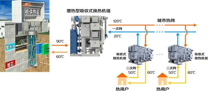 在核供熱首站,設(shè)置增熱型吸收式換熱機組將一次網(wǎng)水的供水溫度由90℃提高至120℃,輸送至城市換熱站,在保證二次網(wǎng)供熱品質(zhì)不變的前提下,經(jīng)吸收式大溫差換熱機組后將一次網(wǎng)水溫降至20℃返回核供熱首站。由于提高了一次網(wǎng)供水溫度,同時降低了一次網(wǎng)回水溫度,從而拉大了供回水溫差,可以大幅減少一次管網(wǎng)初投資費用,降低核供熱系統(tǒng)投資成本和運行成本。